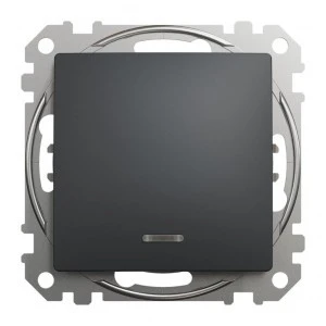 Łącznik schodowy z podświetleniem 16AX, czarny antracyt, to osprzęt serii Sedna Design & Elements marki Schneider Electric. Łącznik schodowy ma malowane wykończenie powierzchni w kolorze czarnego antracytu i posiada następujące wymiary: szerokość 73 mm, wysokość 73 mm, głębokość 37 mm, głębokość wystawania 24 mm. Długość izolacji zdejmowanej z kabla to 13 mm. Łącznik charakteryzuje się stopniem ochrony IP20 i zakresem mocy wynoszącym 3680 W. Do produkcji łącznika wykorzystano tworzywo termoplastyczne o zwiększonej odporności na promie niowanie UV. Produkt jest montowany podtynkowo i posiada zaciski bezśrubowe. Urządzenie może byc wykorzystywane jako tradycyjny włącznik światła lub służyć do załączania innych urządzeń o maksymalnym poborze prądu do 16 AX w instalacjach, w których zachodzi potrzeba ste rowania tym samym źródłem swiatła z 2 różnych punktów. Uwaga: produkty Sedna Design & Elements nie są kompatybilne z serią Sedna!