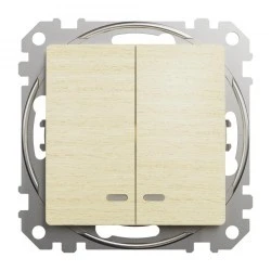 Łącznik świecznikowy z podświetleniem, brzoza, efekt drewna, to osprzęt serii Sedna Design & Elements marki Schneider Electric. Łącznik świecznikowy z podświetleniem ma satynowe wykończenie powierzchni w kolorze brzoza i posiada następujące wymiary: szerokość 73 mm, wysokość 73 mm, głębokość 37 mm, głębokość wystawania 24 mm. Długość izolacji zdejmowanej z kabla to 13 mm. Łącznik charakteryzuje się stopniem ochrony IP20 i zakresem mocy wynoszącym 2300 W. Do produkcji łącznika wykorzystano tworzywo termoplastyczne o zwiększonej odporności na promieniowanie UV, które doskonale imituje naturalne materiały. Produkt jest montowany podtynkowo i posiada zaciski śrubowe. Urządzenie może byc wykorzystywane jako tradycyjny włącznik 2 niezależnych źródeł światła lub służyć do załączania innych urządzeń o maksymalnym poborze prądu do 10 AX. Łącznik świecznikowy posiada 3 zaciski: 2 zaciski, do których podłaczane są odbiorniki, oraz jeden zacisk, do którego podłączone jest zasilanie (L).Uwaga: produkty Sedna Design & Elements nie są kompatybilne z serią Sedna!