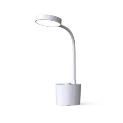 Lampę obsługuje się za pomocą dotykowego włącznika, a wbudowany pojemnik na długopisy i ołówki zwiększa jej funkcjonalność. Minimalistyczny design idealnie pasuje do nowoczesnych wnętrz.