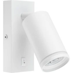 Kinkiet ścienny koloru białego na wymienne źródło światła o trzonku GU10. Lampa wykonana z wysokiej stali, aluminium i akrylu, posiada dekoracyjny pierścień oraz włącznik do czytania umożliwiający łatwe uruchamianie światła.