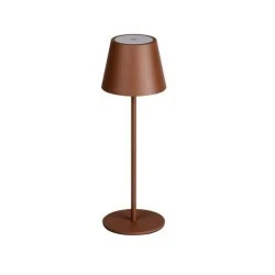 Lampa stołowa LED, Średnica [mm]: 110, Wysokość [mm]: 369, Akumulator (parametry): Li-Ion 1800mA, Akumulator (typ): 18650, Barwa światła: ciepłobiała, Ilość cykli wł/wył: ≥15000, Klasa ochronności przed porażeniem elektrycznym: III, Kolor: brązowy, Materiał klosza: stop aluminium, Materiał obudowy: metal, Miejsce montażu: na podłożu, Miejsce zastosowania: wewnątrz i na zewnątrz, Minimalna odległość od oświetlanego obiektu: 0,1m, Moc maksymalna [W]: max 1,2, Możliwość ściemniania wyłącznie za pomocą wewnętrznego układu elektronicznego: tak, Napięcie znamionowe [V]: 3,7 DC 18650 ACCU, Rodzaj diody: LED SMD, Skuteczność świetlna lampy [lm/W]: max 138, Stopień IP: 54, Strumień świetlny oprawy [lm]: max 165, Temperatura barwowa [K]: 3000, Trwałość [h]: 25000, Włącznik: 1, Współczynnik oddawania barw Ra: 80, Wymienne źródło światła: nie, Zakres temperatury otoczenia, na którą może być narażony wyrób [°C]: -10+35.