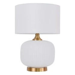 Lampa stołowa Tamiza w białym kolorze to elegancka i ponadczasowa propozycja oświetleniowa, która doskonale odnajdzie się w różnych aranżacjach wnętrz. Jej jasna kolorystyka wprowadza do pomieszczenia poczucie lekkości, harmonii i czystości, subtelnie rozjaśniając przestrzeń. Biały odcień lampy nadaje jej uniwersalnego charakteru, dzięki czemu świetnie komponuje się zarówno z minimalistycznymi, jak i bardziej klasycznymi wystrojami. To nie tylko praktyczne źródło światła, ale również stylowy element dekoracyjny, który podkreśli nowoczesny charakter wnętrza lub dopełni spokojną, stonowaną estetykę. Lampa Tamiza w bieli zachwyca prostotą i klasą, wnosząc do każdego pomieszczenia świeżość i elegancję.Wykonana jest z połączenia białej ceramiki, metalu w złotym kolorze i białego abażura wykonanego z tkaniny.