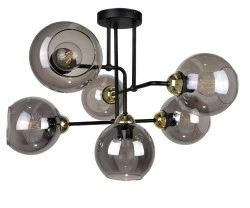 Lampa sufitowa Cosmo w kolorze czarnym z ekskluzywnymi złotymi elementami to wyjątkowy dodatek do każdego wnętrza. Z sześcioma dymionymi kloszami, ta lampa tworzy efektowną aranżację świetlną, wprowadzając do pomieszczenia delikatny, designerski klimat. Złote detale dodają elegancji i subtelnej finezji.