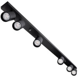 Lampa sufitowa, Kinkiet serii QUALIS z sześcioma punktami świetlnymi, w kolorze czarnym matowym, wykonany z wysokiej jakości aluminium. Kinkiet przystosowany został do żarówek o maksymalnej mocy 50W i trzonku GU10. Reflektory sufitowe swoje zastosowanie znajduje jako oświetlenie dekoracyjne pomieszczeń, dzięki możliwości regulacji reflektora możemy skierować światło w odpowiednie dla nas miejsce. Reflektor został wyposażony w trzonek — gwint GU10. Zaletą lampy z wymiennym źródłem światła jest możliwość wybrania Żarówki o odpowiedniej do naszych potrzeb barwie światła (maksymalna moc żarówki nie może przekraczać 50W).
