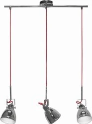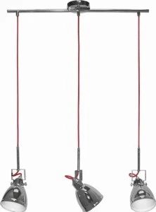 3-płomienna lampa wisząca na listwie AXE III 5445 to nowoczesna propozycja oświetlenia dodatkowego, które zachwyca swoją oryginalną formą. Chromowane, ruchome klosze zawieszono na kontrastowych, czerwonych przewodach, które są wyrazistym akcentem i ożywiają całą kompozycję. Tego typu oprawa doskonale sprawdzi się jako doświetlenie punktowe np. w salonie, jadalni, kuchni, gabinecie, biurze czy korytarzu. Dzięki możliwości regulacji ustawienia klosza strumień światła można skierować w dowolnym kierunku, co pozwala uzyskać pożądany efekt świetlny.