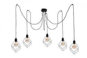 Przedstawiamy lampę wiszącą Ruben Black - niezwykły dodatek do twojego loftowego wnętrza, który nie tylko oświetla pomieszczenie, ale również nadaje mu charakteru. Ta czarna lampa typu pająk posiada pięć punktów świetlnych z czarnymi drutami w kształcie sześcianu, co nadaje jej industrialnego uroku i nowoczesnego wyglądu.