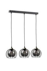 Centralnym punktem lampy są trzy misternie wykonane klosze w formie drucianej kuli, które dodatkowo zdobią subtelne złote akcenty. Złote detale nadają lampie niepowtarzalnego blasku i luksusowego wykończenia. Wnętrze każdego klosza kryje drugi dymiony szklany klosz, tworząc przytulne światło o wyjątkowym charakterze.