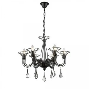 Tarragona 6 wisząca - trzeba naprawdę wielu słów, by dokładnie opisać ten produkt oświetleniowy. Chciałoby się rzec, że w jednym zdaniu jest to oświetlenie zwracające na siebie dużą uwagę! Mianowicie, konstrukcja lampy składa się z pięciu metalowych odnóg, w kształcie litery “U”, zakończone wejściem na źródło światła, których jest sześć.Pasujące żarówki to model - E14. Całość wisi na pięknym łańcuchu. Stelaż nie jest jednolity w budowie, bowiem posiada kilka cieńszych prętów łączących się ze sobą na górze ramienia. Całość utrzymana w barwach czerni. Na dole każdego z ramion lampy wiszące Tarragona, wiszą elementy dekoracyjne, również z metalu w kształcie łezki. Z całą pewnością, oświetlenie to jest, utrzymane w stylu hiszpańskim, zatem pięknie będzie się prezentować w czerwonych, pomieszczeniach urządzonych z charakterem. Serdecznie polecamy i zapraszamy do zakupu!