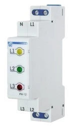 Lampka obecności faz 1 modułowa produkcji Novatek Electro, firmy specjalizującej się w branży produkcją wysokiej klasy urządzeń z zakresu automatyki przemysłowej. Przy podaniu napięcia na PH-12, obecność napięcia sieciowego na danym przewodzie fazowym sygnalizowana jest świeceniem odpowiedniej diody LED. Wskazuje optycznie wartość napięcia przy pomocy trzech zintegrowanych diod LED, oznaczonych jako L1, L2, L3, w kolorach czerwonym, zielonym i żółtym. PH-12, może być zastosowany w sieci TNC, uwzględniającej punkt zerowy. Lamka posiada znamionowe napięcie o wartości 230 V AC. Znamionowy pobór mocy wynosi 0,5 W. Posiada jeden moduł o wymiarach 90x18x64.5 mm. Mocuje się ją na szynie TH-35 na głębokości 66 mm. Ze względu na stopień IP20 jest chroniona przed ciałami obcymi o wielkości 12,5 mm.