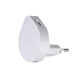 Lampka wtykowa LED, Długość [mm]: 55, Szerokość [mm]: 63, Wysokość [mm]: 64, Barwa światła: ciepłobiała, Częstotliwość znamionowa [Hz]: 50, Jednolitość barw [SDCM]: 6, Klasa ochronności przed porażeniem elektrycznym: II, Kolor: biały, Materiał klosza: tworzywo sztuczne, Materiał obudowy: tworzywo sztuczne, Miejsce montażu: gniazdo zasilające, Miejsce zastosowania: wewnątrz, Moc maksymalna [W]: 0,5, Możliwość współpracy ze ściemniaczem: nie, Napięcie znamionowe [V]: 220-240 AC, Rodzaj diody: LED SMD, Stopień IP: 20, Strumień świetlny oprawy [lm]: 1-30, Temperatura barwowa [K]: 3000.