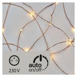auto on/off, kolor przewodów: miedziany, barwa światła: ciepła biel, długość łańcucha LED: 10 m, długość przewodu: 5 m, stopień ochrony: IP44, odstęp między diodami LED: 10 cm, napięcie: 230 V, ilość LED: 100, zastosowanie: zewnętrzne i wewnętrzne, do wysokości choinki: 160 cm, opakowanie: 1 szt., pudełko, moc: 3,6 W, tryby świecenia: świeci, kształt: nano, typ: nano łańcuch – miedziany, typ zasilania: sieć, wielkość diod LED: nano 3 mm, okres gwarancyjny: 2 lata, żywotność: 50 000 godzin