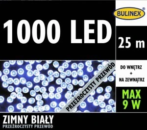 Dekoracja świetlna 1000 LED do stosowania wewnątrz i na zewnątrz pomieszczeń, wyposażona w zasilacz i 3-metrowy przewód zasilający, umożliwiający wygodny montaż.
