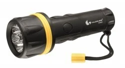 Gumowa latarka ręczna LED. Zasilane 2 bateriami typu R20 7 diod LED może pracować bez przerwy do 60 h. W zestawie znajduje się pasek na rękę zapobiegający przypadkowemu upuszczeniu.