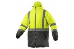 Nowoczesna, ocieplana męska kurtka ostrzegawcza typu parka. Posiada dwie taśmy odblaskowe dookoła barków i rękawów oraz jedną taśmę dookoła tułowia. Starannie wykonana z najwyższej jakości materiałów. Zapewnia maksymalny komfort oraz ochronę przed zimnem i wiatrem. Chroni również przed deszczem (wodoodporność na poziomie 2000 mm H2O). Zwiększa bezpieczeństwo podczas przebywania w warunkach ograniczonej widoczności np. w trakcie przemieszczania w nocy oraz podczas złych warunków pogodowych np. w czasie deszczu lub mgły. Szczególnie polecana w okresie jesiennym i zimowym.