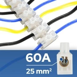 Model LTF 12x25 posiada 12 torów (12 niezależnych zacisków), co pozwala na wygodne i stabilne podłączenie nawet dwunastu par przewodów z maksymalnym przekrojem do 25 mm² (maksymalny prąd 60A).