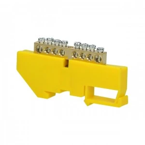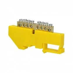 Listwa zaciskowa do przewodu uziemiającego (żółta). Stosowana w rozdzielniach elektrycznych ułatwia rozdział potencjałów i okablowania. Nadaje się do montażu na szynę DIN.