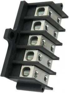 Listwa zaciskowa czarna typu ZGX, pięciobiegunowa z dziesięcioma otworami, dla przewodów o przekroju od 1,5 do 35 mm2, w kompaktowej obudowie o małych wymiarach, wykonanej z tworzywa PA6 bez halogenowego sklasyfikowanego w najwyższym standardzie palności UL V-0 .