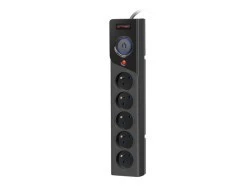 Listwa zasilająca posiada pięć gniazd sieciowych z uziemieniem wyposażonych w bezpiecznik automatyczny o charakterystyce zwłocznej 10A/250V, który umożliwi ponowne załączenie zasilania w przypadku wystąpienia awarii typu zwarcie/przeciążenie, po usunięciu przyczyny tego stanu.