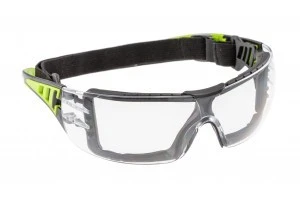 Soczewki okularów wykonane są z bezbarwnego poliwęglanu profilowanego, dzięki czemu zapewniają boczną ochronę oka i skroni. Miękka wyściółka wokół szkieł i zdejmowany pasek zapobiegają ślizganiu i zsuwaniu okularów. Ramiona wytworzono z poliwęglanu, natomiast zauszniki z wysokiej jakości materiału typu TPR (syntetycznie zoptymalizowana guma). Dodatkowo ramiona wyposażono w specjalistyczne kanaliki wentylacyjne, które uniemożliwiają parowanie soczewki. Okulary chronią przed odpryskami ciał stałych o niskiej energii powstałymi podczas szlifowania, wiercenia, cięcia, piłowania, kruszenia. Idealnie sprawdzą się w typowych pracach w przemyśle i usługach, budownictwie, warsztatach, leśnictwie, przy pracach gospodarczych i komunalnych. Nie nadaje się do użytku podczas spawania.