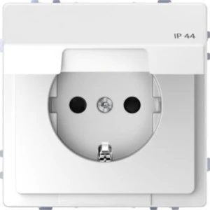 Merten, System Design, gniazdo wtykowe SCHUKO z klapką, przesłoną torów prądowych, IP44, zaciski bezśrubowe, biały lotos, to osprzęt serii Merten mark i Schneider Electric. Gniazdo wtykowego ma lśniące wykończenie powierzchni w kolorze biały lotos i posiada następujące wymiary: długość 71 mm, wysokość 45 mm, szerok ość 71 mm. Gniazdo charakteryzuje się stopniem ochrony IP 44, prądem 16A / 250VAC. Produkt jest montowany podtynkowo i posiada zaciski bezśrubowe. Sposób montowania przez wkręty i szczypce.