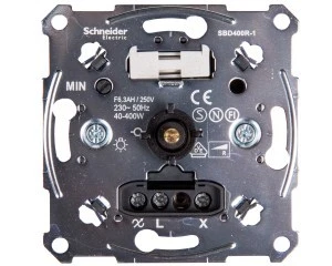 Merten, mechanizm ściemniacza obrotowego R 230V AC 40-400W, to osprzęt serii Merten marki Schneider Electric. Mechanizm ściemniacza obrotowego charakteryzuje się stopniem ochrony IP20. Do produkcji elementu wykorzystano metal i plastik. Produkt jest montowany podtynkowo i posiada następujące wymiary: szerokość 71 mm, wysokość 71 mm, głębokość zagnieżdżenia 29 mm. Mechanizm łączy się z płytką centralną ściemniacza obrotowego.