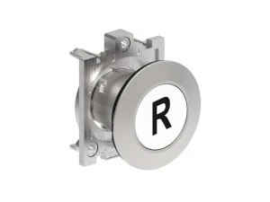 Metalowy przycisk płaski fi30mm kryty samoczynny powrót z symbolem R Biały LPFB1178
