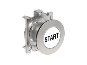 Metalowy przycisk płaski fi30mm kryty samoczynny powrót z symbolem START Biały LPFB1168