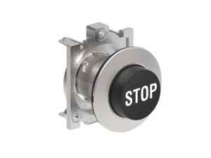 Metalowy przycisk płaski fi30mm wystający samoczynny powrót z symbolem STOP Czarny LPFB2132