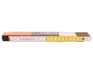 Miara składana drewniana NEO (nr ref. 74-020) o długości 2 m i grubości członu 2,85 mm. Wykonana z wysokiej jakości drewna bukowego, posiada obustronną podziałkę. Wykonana w III klasie dokładności pomiaru. Podwójne lakierowanie zabezpiecza przed ścieraniem, wilgocią oraz działaniem promieni słonecznych. Zastosowanie dwóch kolorów ułatwia odczytywanie pomiaru. Gwarantem niezawodności jest wykonanie zgodne z unijną dyrektywą o przyrządach pomiarowych MID. Marka NEO spełnia oczekiwania profesjonalistów.