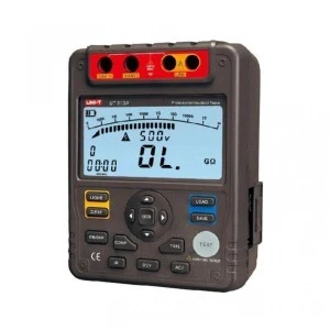 UT513A produkcji Unit przeznaczony do pomiarów elektrycznych rezystancji izolacji - tzw. induktor, giga-omomierz. Miernikiem UT513A możliwy jest pomiar rezystancji izolacji do 100G?, a napięcia probiercze wybierane przez elektryka w trakcie pomiarów: 500V, 1000V (1kV), 1500V (1,5kV) i 2500V (2,5kV). Dodatkowo miernik UT513A ma wbudowany woltomierz napięcia przemiennego AC do 600V i stałego DC do 600V. W mierniku rezystancji izolacji UT513A elektryk ma dodatkowo funkcję pomiaru współczynnika absorpcji DAR i wskaźnika polaryzacji PI. Miernik UT513A wykorzystywany jest w trakcie pomiarów instalacji elektrycznej przy odbiorach budynków, sprawdzania izolacji w liniach kablowych, uzwojenia transformatorów, silników elektrycznych itp. Miernik UT513A posiada duży i wyświetlacz LCD z podświetleniem i bargrafem (element dodatkowy na wyświetlaczu jest 30 punktowa linijka tzw. bargraf symulująca wychylenie się wskazówki pomiarowej analogicznie jak w miernikach analogowych.) Obudowa wykonana z wytrzymałego tworzywa. Urządzenie pomiarowe charakteryzuje wysoka dokładność i stabilność. Dzięki poręcznym wymiarom, zasilaniu na baterie oraz intuicyjnej obsłudze, przyrząd ten idealnie sprawdzi się w każdych warunkach. W zestawie z miernikiem UT513A otrzymujemy praktyczną walizkę plastikową mieszczącą cały zestaw pomiarowy.