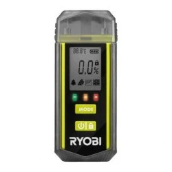 Wilgotnościomierz RBPINMM1 RYOBI oferuje cztery tryby wykrywania wilgotności w drewnie iglastym, liściastym, płytach gipsowych i betonie napowietrzonym.