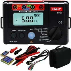 UNI-T UT526 to wielofunkcyjny miernik cyfrowy łączący w sobie nowoczesny wygląd, i zaawansowaną technologię opartą o analogowe i cyfrowe układy scalone oraz mikroprocesor, umożliwiające testowanie najważniejszych parametrów instalacji elektrycznych takich jak rezystancja izolacji, rezystancja pętli linii (uziemienia), test wyłączników różnicowo prądowych (RCD), oraz umożliwiają pomiary napięcia DC i AC oraz częstotliwości. Mimo swojej uniwersalności są to mierniki o dużej dokładności i stabilności oraz łatwości w obsłudze. UT526 to idealny wybór dla techników zajmujących się naprawą i utrzymaniem różnorodnych urządzeń oraz instalacji elektrycznych.