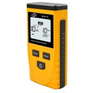 Miernik rezystencji powierzchni GM3110 marki Benetech, służy do pomiaru wartości oporu poprzez przyłożenie dwóch równoległych elektrod do mierzonej powierzchni, w celu ocenienia czy badany obiekt jest przewodnikiem, materiałem statycznym czy izolatorem.