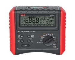 ZAKRESY POMIAROWE Rezystancja izolacji Dla napięcia probierczego: 250 V: 0,05 MOhm ~ 250 MOhm ±(5%+5) 500 V: 0,05 MOhm ~ 500 MOhm ±(5%+5) 1000 V: 0,05 MOhm ~ 1000 MOhm ±(5%+5) Prąd testujący: 0,9 ~ 1,1 mA Prąd zwarcia: < 1,8 mA Test wyłączników różnicowoprądowych RCD Natężenia prądów testujących (In): 10 mA / 30 mA / 100 mA / 300 mA / 500 mA Napięcie sieci: 220 V ±10%; 45 ~ 65 Hz Zakresy czasu wyłączania: dla 1 In: 0 ~ 2000 ms ±(5%+5) dla 1 In: 0 ~ 500 ms ±(5%+5) dla 5 In: 0 ~ 40 ms ±(5%+5) Pomiar natężenia prądu narastającego (rampa) Dokładność natężenia prądu wyłączania: 10% Impedancja pętli zwarcia: Napięcie sieci (L-E): 220 V ±10%; 45 ~ 65 Hz Natężenie prądu testującego/czas testu: 20 A/20 ms Zakresy pomiarowe: 0,05 Ohm ~ 1,99 Ohm ±(5%+5) 2 Ohm ~ 19,9 Ohm ±(5%+5) 20 Ohm ~ 2000 Ohm ±(5%+5) Zakres pomiarowy prądu bezpieczeństwa: 0 ~ 26 kA POZOSTAŁE ZAKRESY POMIAROWE Małe rezystancje: 0,01 Ohm ~ 200 Ohm ±(2%+5) Napięcie prądu zmiennego AC : 0 ~ 440 V ±(2%+3) Napięcie prądu stałego DC: 0 ~ 440 V ±(2%+3) Częstotliwość: 20 Hz – 100 Hz (tylko dla celów porównawczych) DODATKOWE FUNKCJE Ręczna/automatyczna zmiana zakresów pomiarowych Test kolejności faz Wskaźnik niskiego poziomu baterii Ostrzeżenie o wysokim napięciu Podświetlany ekran LCD Buzzer Wyświetlacz pomocniczy Maksymalny odczyt: 9999 Funkcja zerowania CECHY OGÓLNE Zasilanie: 8x bateria 1,5 V (LR6) Wyświetlacz: 125 x 37 mm Wymiary: 210 x 175 x 90 mm Waga: 1000 g W zestawie: baterie, przewody pomiarowe, specjalny przewód pomiarowy, końcówki pomiarowe, krokodylki pomiarowe, sonda pomiarowa, etui
