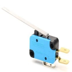 Mikrołącznik krańcowy w obudowie z tworzywa wyposażony w długą, metalową dźwignię.