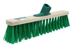 Drewniana miotła ze sztucznym włosiem dzięki któremu charakteryzuje się wysoką trwałością.