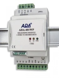 Zastosowanie cyfrowych czujników temperatury, wilgotności względnej, ciśnienia atmosferycznego z intefejsem 1-WIRE, które zmierzoną wartość pomiaru przekazują za pomocą protokołu transmisji danych eliminuje wpływ długości przewodów na pomiar jak ma to miejsce w systemach bazujących na analogowym przetwarzaniu sygnału. Zaletą stosowania cyfrowych czujników jest również znacznie łatwiejsze niż w rozwiązaniach standardowych (analogowych) prowadzenie procedur testowych, które pomagają wyeliminować niesprawne elementy systemu. Jednak komunikacja z czujnikami 1-WIRE nie należy do najprostszych i trudno jest ją zaimplementować w sterownikach przemysłowych. Rozwiązaniem tej niedogodności jest adresowalny moduł pomiarowy dla czujników z interfejsem 1-WIRE ADA-401WP z zaimplementowanym protokołem MODBUS-RTU. Umożliwia on na bazie magistrali RS485 i protokołu MODBUS-RTU budowanie sieci z adresowalnymi węzłami, do których można podłączyć wiele czujników z interfejsem 1-WIRE. Zastosowanie modułu pomiarów ADA-401WP jako adresowalnego węzła dla magistrali 1-WIRE pozwala na zwiększenie odległości do 1200m między urządzeniami 1-WIRE a komputerem PC z oprogramowaniem monitorującym typu SCADA czy innym urządzeniem typu MASTER np. sterownikiem PLC. Zastosowanie dodatkowego konwertera RS232 / RS485 ADA-1040 lub USB/RS485 ADA-I9140 umożliwia monitorowanie modułów ADA-401WP poprzez interfejs RS-232 lub USB z komputera klasy PC wyposażonego w odpowiednie oprogramowanie typu SCADA. ADA-401WP wyposażony jest w listwę zacisków śrubowych dla skrętkowych połączeń magistrali 1-WIRE i RS-485, a także do podłączenia zasilania. Ochronę przeciwprzepięciową na każdej linii RS-485 wykonano na bazie diod przeciwprzepięciowych 600W i bezpieczników. ADA-401WP przystosowany jest do zasilania z zewnętrznego źródła napięcia stałego stabilizowanego, którego wartość powinna zawierać się w granicach od 10V= do 30V=, pobór mocy 3W. Posiada również wbudowane zabezpieczenie przed odwrotną polaryzacja zasilania.