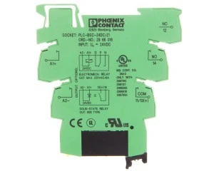 PLC-INTERFACE, składający się ze złączki gniazdowej PLC-BSC.../21 z połączeniem śrubowym i wtykowym miniaturowym przekaźnikiem półprzewodnikowym, do montażu na szynie nośnej NS 35/7,5, 1 zestyk zwierny, wejście: 24 V DC, wyjście: 3–33 V DC/3 A