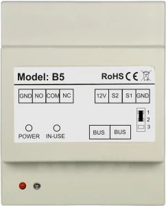 B5 to specjalny moduł przeznaczony do pracy w systemie VIDOS DUO. Posiada funkcję rozszerzenia funkcjonalność systemu o możliwość obsługi drugiego rygla/bramy lub sterowanie oświetleniem. Moduł umożliwia również obsługę rygli wysokoprądowych oraz otwieranie wejścia przy użyciu dodatkowego przycisku zwiernego NO przy wyjściu z posesji.