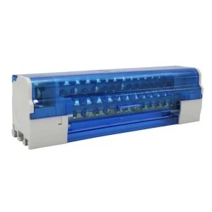 Modułowy blok rozdzielczy UK DTB 215 przeznaczony do dystrybucji przewodów elektroenergetycznych. Mostek oferowany w wykonaniu 2-biegunowym z 15 wyjściowymi jednostkami zaciskowymi. Śruby dokręca się kluczem imbusowym i śrubokrętem PH 2. Mostki rozdzielcze posiadają łatwo otwieralną górną pokrywę wykonaną z przezroczystego tworzywa sztucznego w kolorze niebieskim. Mogą być używane na przykład jako listwa zaciskowa do dystrybucji przewodów zasilających lub jako centralna listwa zaciskowa do mostków N za ochronnikami prądowymi. Sposób montazu na szynie TH 35. Zgodny z normą EN 60947-7-1.