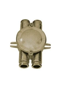 Solidna, mosiężna, natynkowa puszka z pokrywą, 4 wyjścia z dławikami.