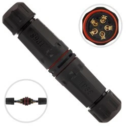 Solidne, skręcane złącze kablowe gwarantujące trwałe i szczelne połączenie. Idealne rozwiązanie, aby szybko połączyć i schować przewody, znakomicie sprawdza się jako element do przedłużenia przewodu lub zestaw naprawczy.