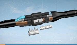 Mufa termokuczliwa marki Raychem ze złączkami śrubowymi dla żył Al oraz Cu w szerokim zakresie stosowania.