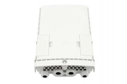 Mufa-przełacznica TELCOLINE GFP-24S-WH zaprojektowana została do montażu naściennego lub na słupie telekomunikacyjnym. Posiada cztery wejścia na kable magistralne (w tym 2 dławikowe PG13.5) oraz 24 wyjścia na kable klienckie. Wykonana została na kompozycie tworzywa PC+ABS w kolorze białym, które chroni przed ciężkimi warunkami atmosferycznymi (temp. w zakresie -35°C ~+75°C, wilgoć, promieniowanie UV), substancjami chemicznymi oraz wszelkiego rodzaju zanieczyszczeniami i pyłami. Stopień ochrony dla urządzenia to IP65 (6 - Ochrona pyłoszczelna, 5 - Ochrona przed strumieniem wody lanym na obudowę z dowolnej strony). Wnętrze mufy wyposażone jest w odchylaną płytę na której znajdują się 24 otwory do montazu adapterów światłowodowych typu SC simplex lub LC duplex. Miejsce pod płytą zagospodarowane jest na ułożenie do 24 spawów światłowodowych oraz organizację włókien i cienkich przewodów. Wyjścia na kable abonenckie wyposażone są w uszczelnienia z tworzywa sztucznego zapewniające szczelność urządzenia.