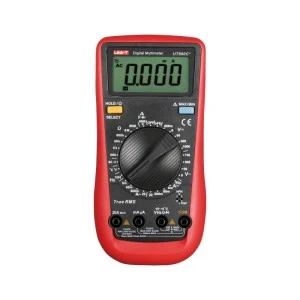 UT890C+ to cyfrowy multimetr uniwersalny produkcji Uni-t. Oferowany miernik UT890C+ umożliwia wykonanie najczęściej mierzonych parametrów elektrycznych: pomiar napięcia DC/AC, pomiar prądu DC/AC, pomiar częstotliwości, pomiar temperatury, pomiar ciągłości obwodu elektrycznego, pomiar oporności, pomiar pojemności kondensatorów. UT890C+ mierzy wartość skuteczną napięcia i prądu zmiennego AC. Za pomocą miernika UT890C+ sprawdzimy diody półprzewodnikowe, oraz tranzystory bipolarne npn i pnp (pomiar bety hfe). Z dodatkowych funkcji mamy możliwość zarejestrowania wartości MAX i MIN w trakcie trwania pomiaru, funkcję zatrzymania wskazania na wyświetlaczu. Multimetr UT890C+ wyposażony jest w podświetlany wyświetlacz LCD o maksymalnym wskazaniu wyniku pomiarowego 6000.