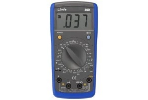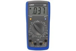 Multimetr cyfrowy Limit 400 z ręcznym wyborem zakresu. Do mierzenia napięcia stałego/przemiennego, prądu stałego/przemiennego, rezystancji, pojemności, częstotliwości i temperatury. Limit 400 Ponadto posiada następujące funkcje: test diodowy, test tranzystorów, test ciągłości obwodu z sygnalizacją akustyczną, pamięć wyniku pomiaru Hold, sygnalizacja niskiego stanu baterii. Dostarczany w komplecie z kabelkami pomiarowymi, baterią i instrukcją obsługi. Długość podziałki 1999. Izolacja CAT II 600 V / CAT I 1000V wg IEC 61010. Zabezpieczenie nadprądowe 20 A.
