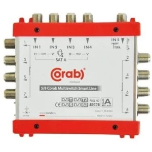 CORAB MULTISWITCH SMART LINE jest to urządzenie służące do rozdzielenia sygnału telewizyjnego, posiada 5 wejść: 4-y satelitarne i 1-dno naziemne oraz 8 wyjść satelitarno-naziemnych. Multiswitch posiada wewnętrzny zasilacz a wysokiej jakości obudowa gwarantuje wysoki poziom ekranowania. W przypadku zbyt silnego sygnału urządzenie ma możliwość obcięcia go o +/- 20bB za pomocą przełącznika "active".
