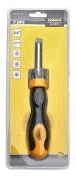 Dzięki specjalnemu magazynkowi groty zawsze są pod ręką Dwukomponentowa ergonomiczna gumowana rękojeść zapobiega wyślizgiwaniu się wkrętaka z dłoni podczas pracy Wykonanie grotów ze stali chromowo-wanadowej zapewnia długą żywotność produktu