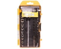 • wkrętak "T" 180 mm • nasadki w rozmiarach: 5, 6, 7, 8, 9, 10, 11, 12 mm • groty PHILIPS: PH0, PH1, PH2, PH3 • groty POZIDRIVE: PZ0, PZ1, PZ2, PZ3 • groty PŁASKIE: 3, 4, 5, 6, 7 mm • groty TORX: T10, T15, T20, T25, T27, T30, T40 • akcesoria: redukcja, uchwyt do grotów, 1/4"-50mm