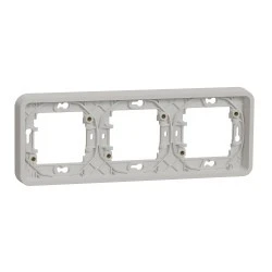 Mureva, podstawa podtynkowa potrójna pozioma, biała, MUR39109, to osprzęt serii Mureva marki Schneider Electric. Podstawa podtynkowa potrójna pozioma ma wykończenie powierzchni w kolorze białym i posiada następujące wymiary: szerokość 84 mm, wysokość 23 mm, długość 226 mm, głębokość wystawania 19 mm. Produkt charakteryzuje się stopniem ochrony IP55. Do produkcji podstawy wykorzystano tworzywo termoplastyczne o zwiększonej odporności na promieniowanie UV. Produkt jest montowany podtynkowo.